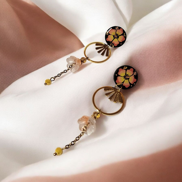 Découvrez les boucles d'oreilles Flora dessinées à la main. Ces boucles d'oreilles pendantes sont des créations uniques et élégantes, fabriquées à la main avec amour et passion. C'est une exclusivité Mélodie en Couleurs.