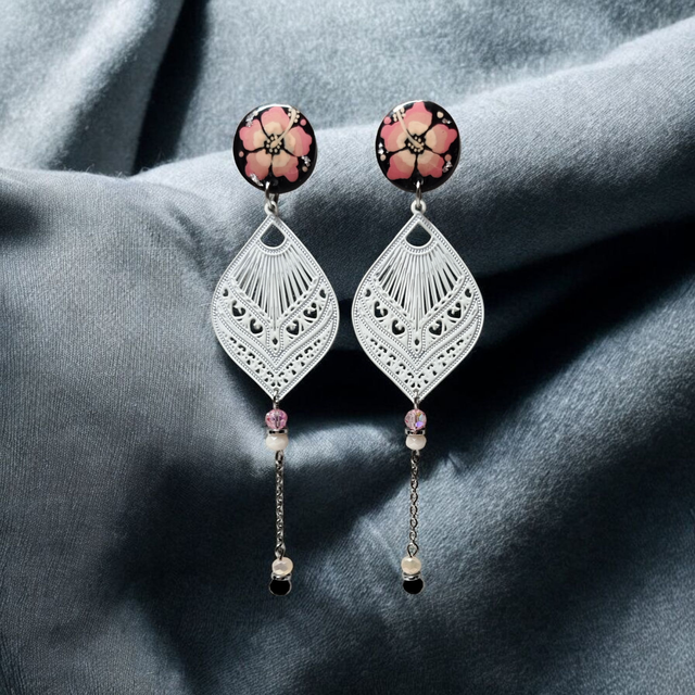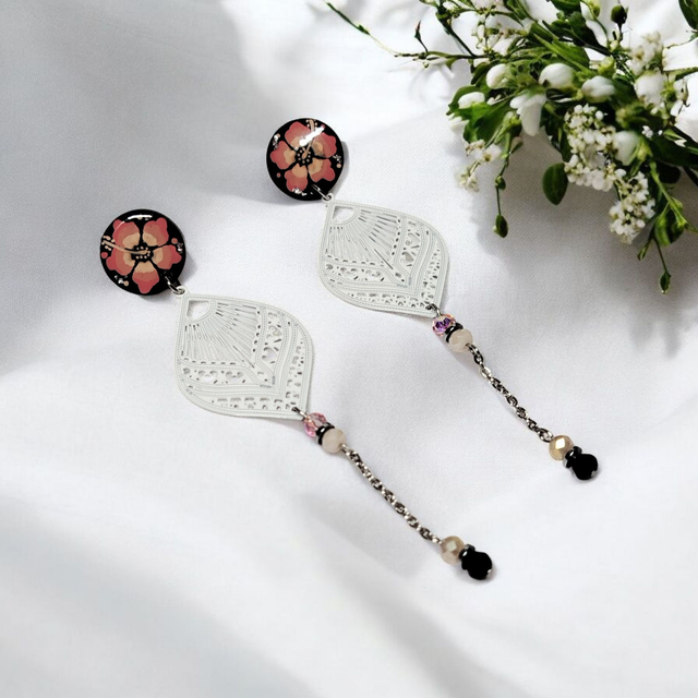 Découvrez les boucles d'oreilles Flora dessinées à la main. Ces boucles d'oreilles pendantes sont des créations uniques et élégantes, fabriquées à la main avec amour et passion. C'est une exclusivité Mélodie en Couleurs.