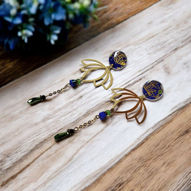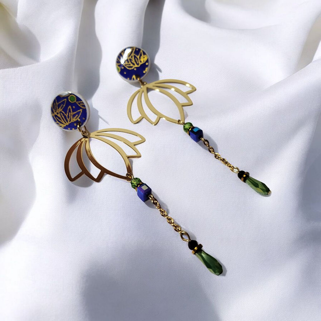 Boucles d'oreilles pendantes motifs japonais bleu foncé