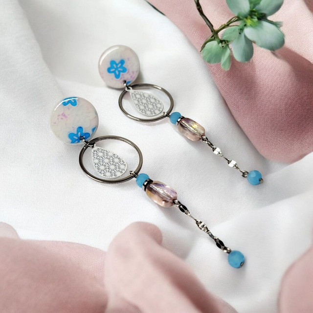 Boucles d'oreilles pendantes motifs japonais bleu rose blanc