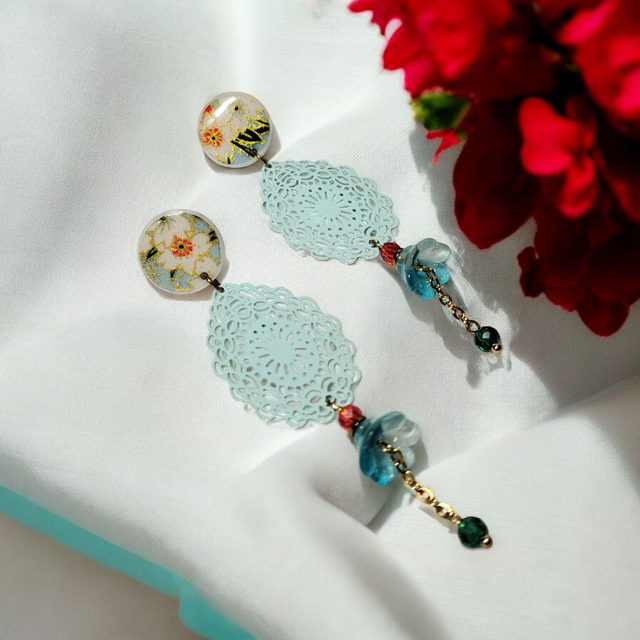 Boucles d'oreilles pendantes motifs japonais bleu rouge