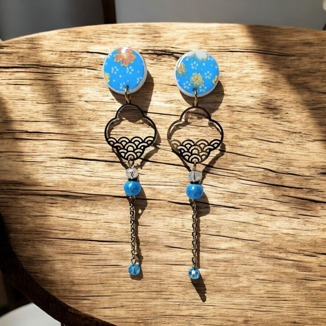 Boucles d'oreilles pendantes motifs japonais bleu turquoise