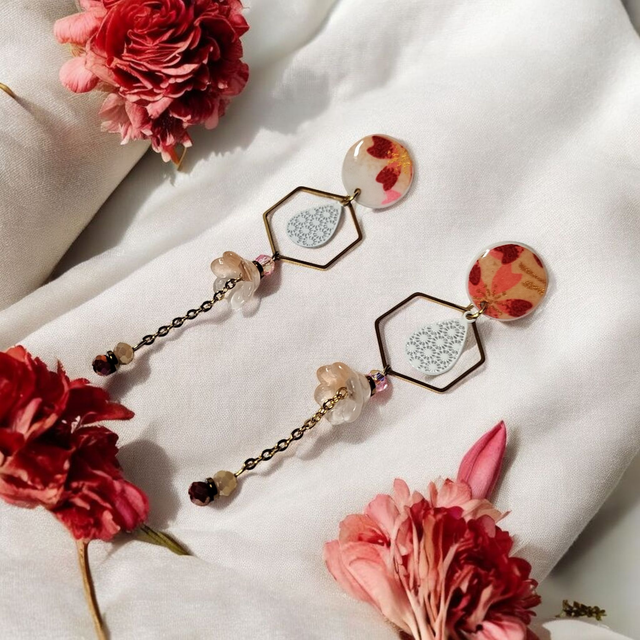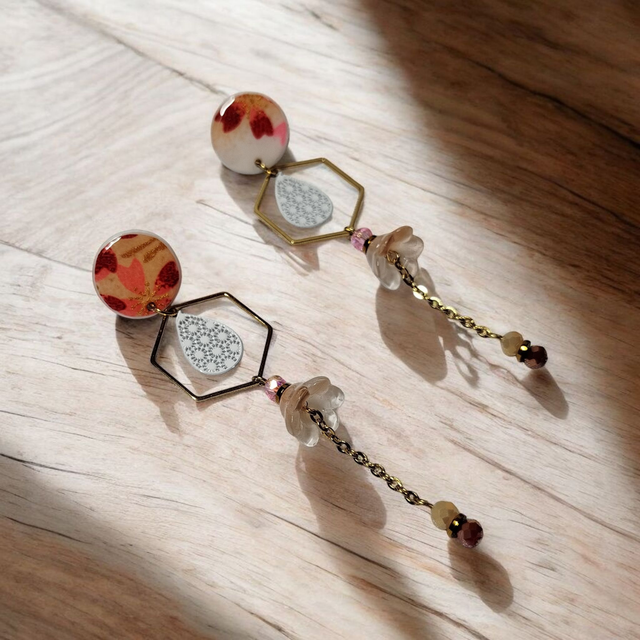 Boucles d'oreilles pendantes motifs japonais pêche et bordeaux