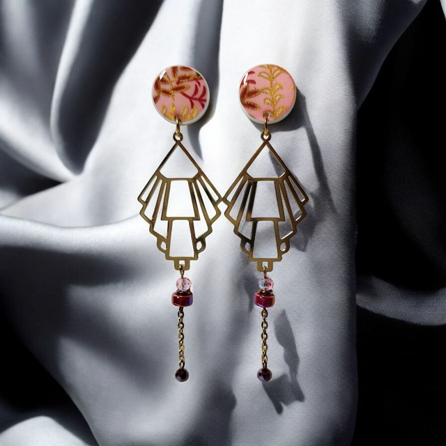 Boucles d'oreilles pendantes motifs japonais rose et bordeaux