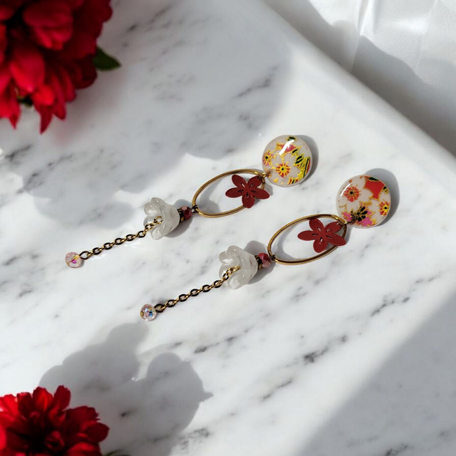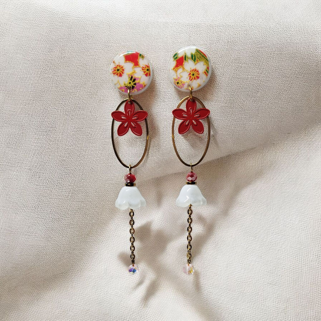 Boucles d'oreilles pendantes motifs japonais rouge blanc