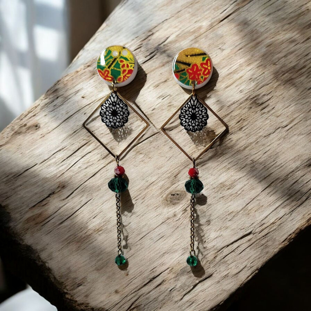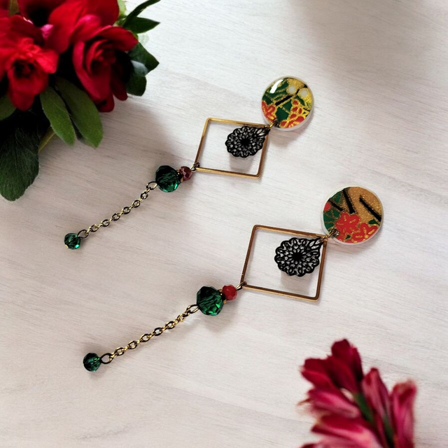 Boucles d'oreilles pendantes motifs japonais vert rouge noir