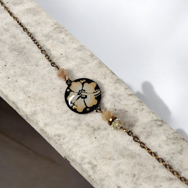 Découvrez les bracelets Flora, uniques, dessinés et fabriqués à la main avec passion et créativité. Chaque pièce est une œuvre d'art originale, créée sur une chaîne en acier inoxydable, avec chaînette de prolongation pour un ajustement parfait idéal pour les poignets de 16 à 21 cm. le connecteur dessiné mesure 1,4cm (14mm) les perles sont en cristal et intercalaire hématite.