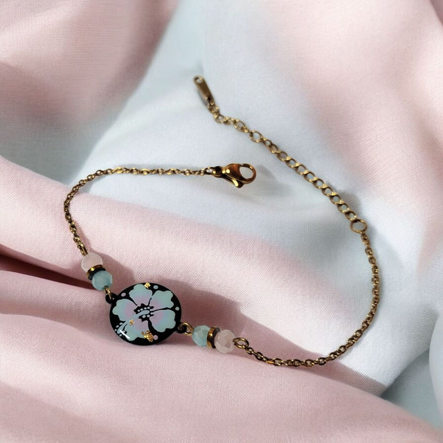 Découvrez les bracelets Flora, uniques, dessinés et fabriqués à la main avec passion et créativité. Chaque pièce est une œuvre d'art originale, créée sur une chaîne en acier inoxydable, avec chaînette de prolongation pour un ajustement parfait idéal pour les poignets de 16 à 21 cm. le connecteur dessiné mesure 1,4cm (14mm) les perles sont en cristal et intercalaire hématite.