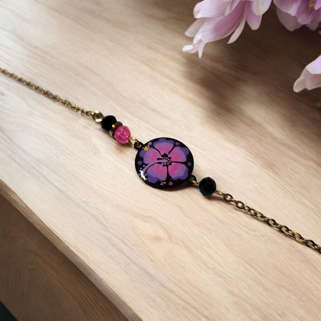 Bracelet dessiné Flora acier inoxydable violet et fuchsia