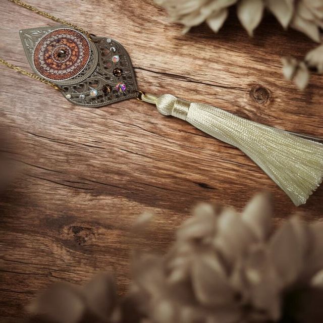 Les connecteurs en laiton ajoutent une touche de sophistication, tandis que le pompon et les perles donnent une allure élégante et raffinée. Les motifs sont une reproduction d'un de mes dessins.