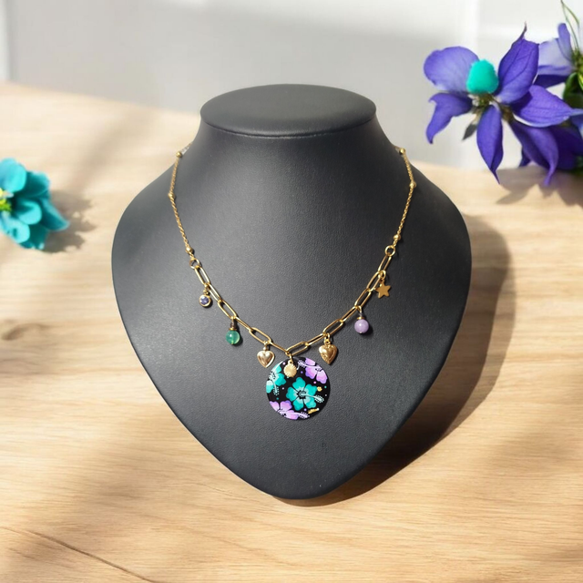 Collier breloques acier inoxydable Flora dessiné bleu turquoise et parme