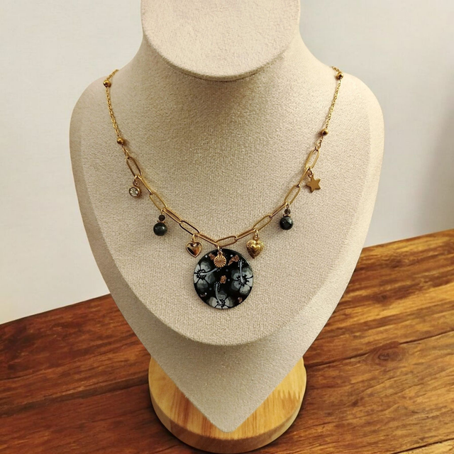 Collier breloques acier inoxydable Flora dessiné noir gris