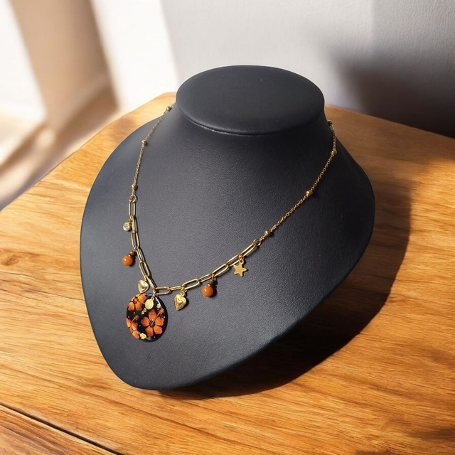 Découvrez les colliers breloques Flora, uniques, dessinés et fabriqués à la main avec passion et créativité. Chaque pièce est une œuvre d'art originale, créée sur une chaîne en acier inoxydable mixte de 44,5 cm, avec une chaînette de prolongation de 5 cm pour un ajustement parfait. Le pendentif central mesure 3 cm (30mm)